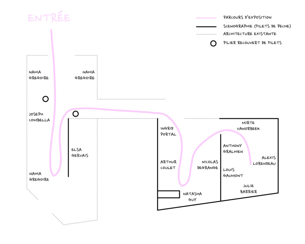 Les œuvres ont été présentées dans une scénographie immersive faite de chutes de filets éco-sourcés à Dieppe.